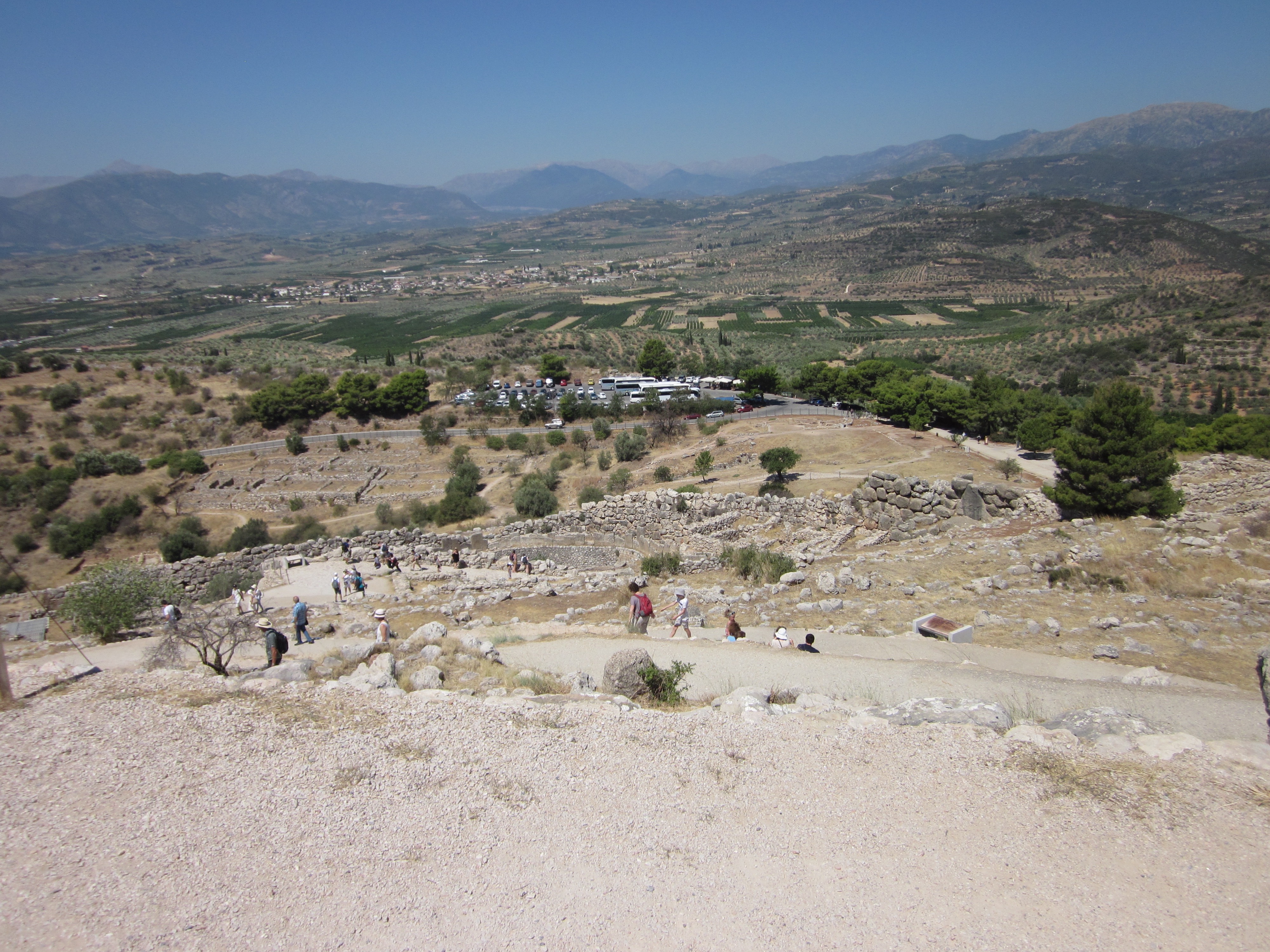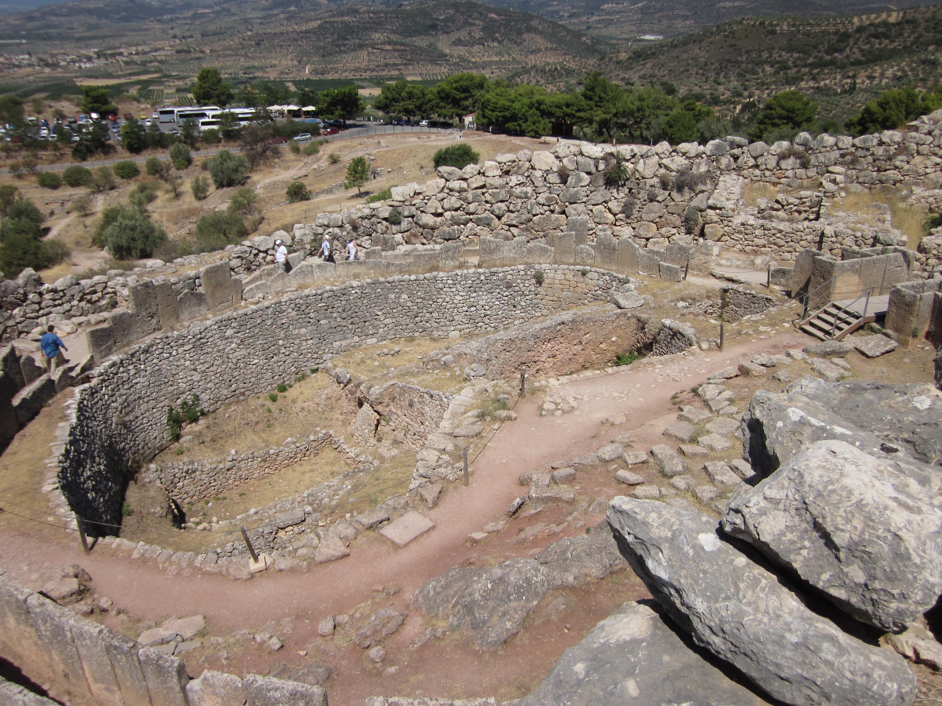 IMG_0246After passing through the Lion’s Gate you see “Grave Circle A” on your right, which was one of the first things that German archaeologist Heinrich Schliemann uncovered in 1874. He (wrongly) assumed that this was the tomb of Agamemnon, because he found so much gold with the bodies found there. This included five gold burial masks, the most magnificent of which is (still inaccurately) named the “Mask of Agamemnon.” It’s in the National Archeological Museum in Athens, and I haven’t been there yet, but hopefully I’ll post a picture of it (or not.)