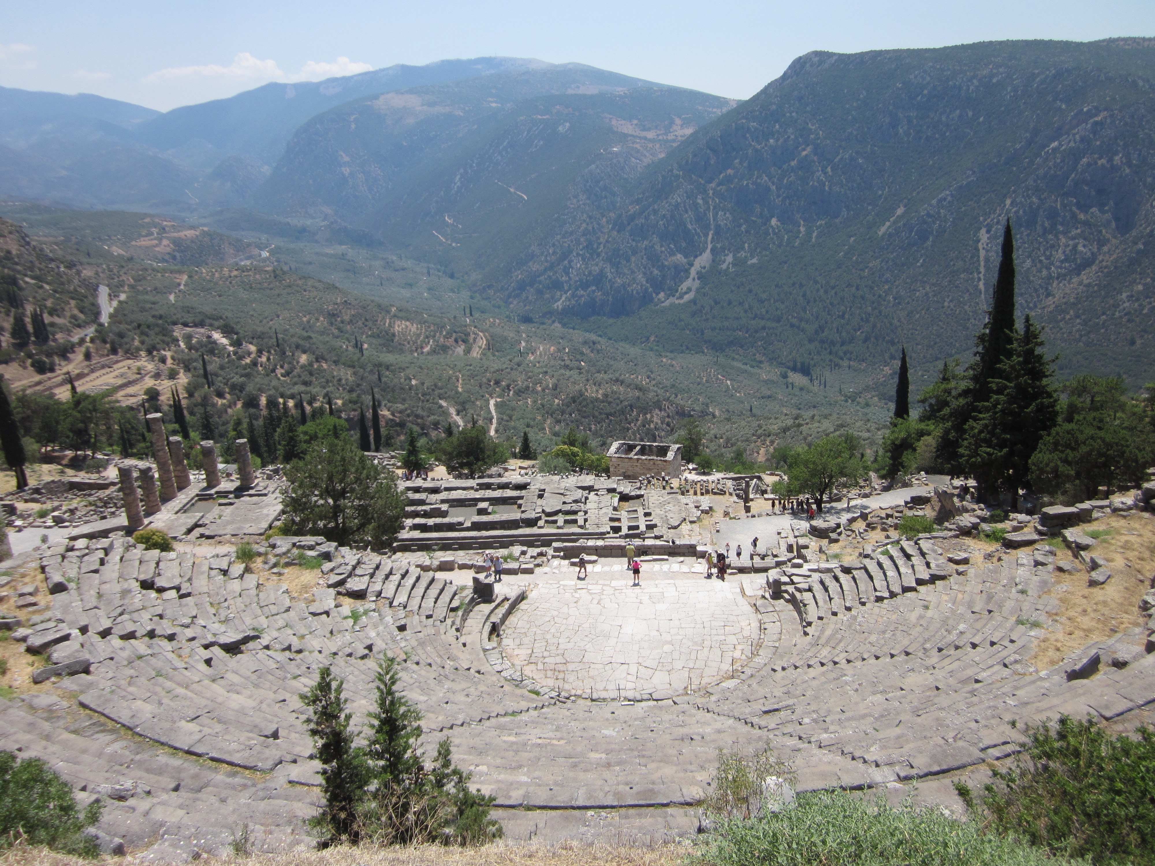 It was built of stones from Mount Parnassos in the 4th century BCE to replace an earlier wooden one, and was then enlarged in the 2nd century BCE. It seats around 5,000 spectators. You can tell it is “newer” than the theater at Epidaurus because the orchestra isn’t a full circle, but the diameter is wider. The area for the skene or “scenery building” is rather small, and was probably somewhat low to allow the audience a better view of the surrounding landscape. By this point in history, the proskenion had also developed, moving the main playing area from the orchestra to today’s “stage.” I suspect they had the ability to cover it like the Romans did with an awning, although I didn’t look for evidence of this while I was there.