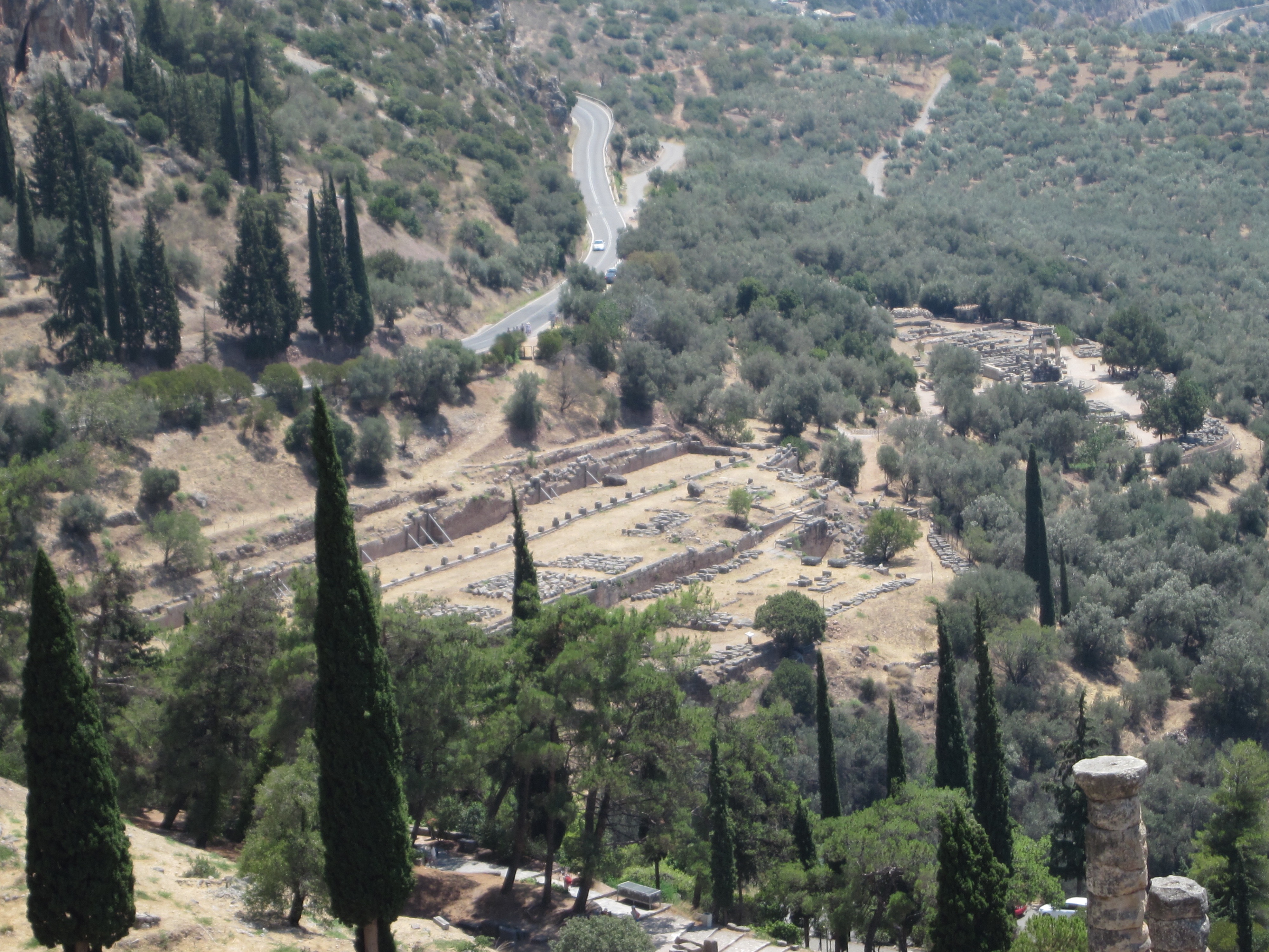 Also on the hillside far below the temple of Apollo are a gymnasium and a small sanctuary dedicated to Athena. The gymnasium was used for military training, and training for the Pythian Games which grew out of that training and took place in the stadium at the top of the hill above the theater. A couple next to me was contemplating walking down to it and the conversation went something like this: