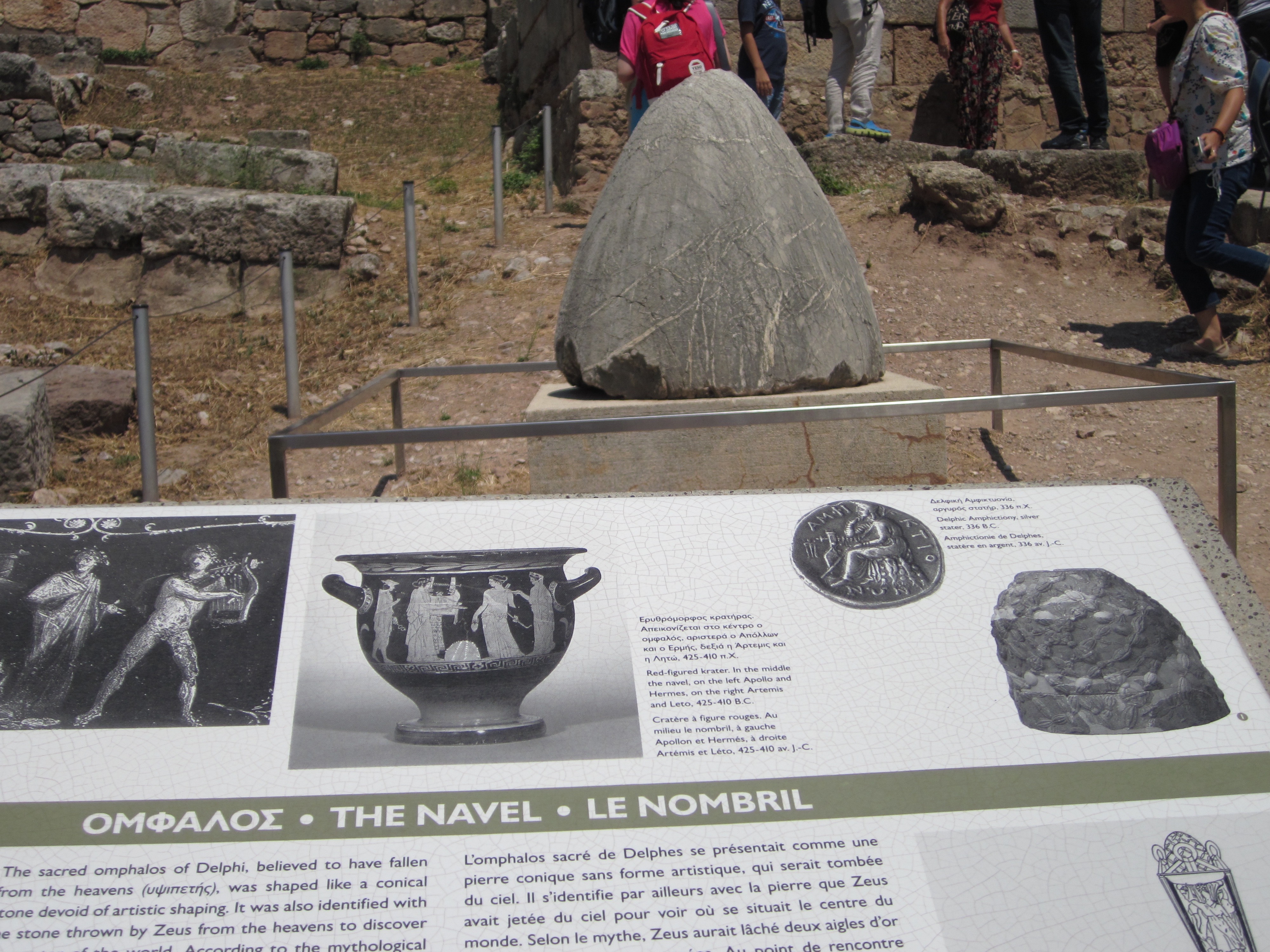 Thank you, Casey Kasem! That’s right, folks, and I don’t mean Delphi, Indiana, although I’ve been there too. Located three hours northwest of Athens, and tucked into the southern slope of Mount Parnassos, out of view from marauding ships, sits the spiritual center of the Greek universe. There is a myth where Zeus sent two eagles to find the center of the world, so he released them at opposite ends, and this is where they met. That’s why Delphi is known as “the navel of the Earth,” and here’s the physical representation, the omphalos. It’s an “outie” with a hole in the top.